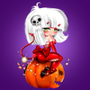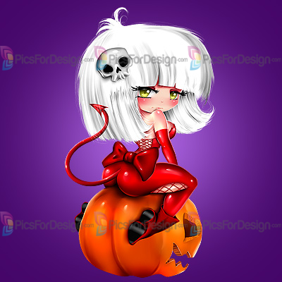red, devil, girl, white hair, halloween, pumpkin, latex, Toon, Anime, green eyes, sexy, horns, tail, skull