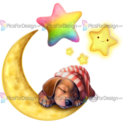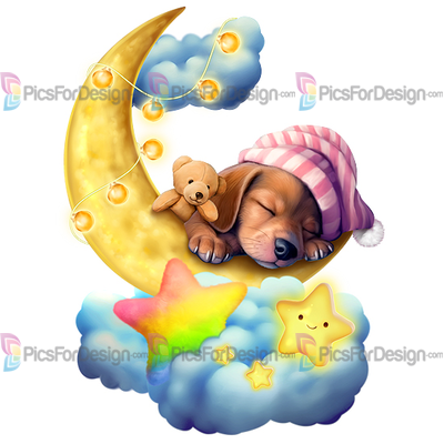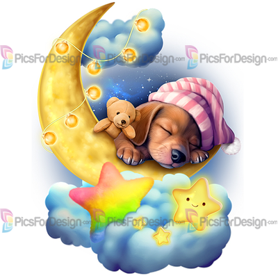 animal, puppy, dog, pet, friend, sleep, teddy bear, toy, night, moon, clouds, soft pillow, stars, sky, sweet dreams, dreams