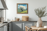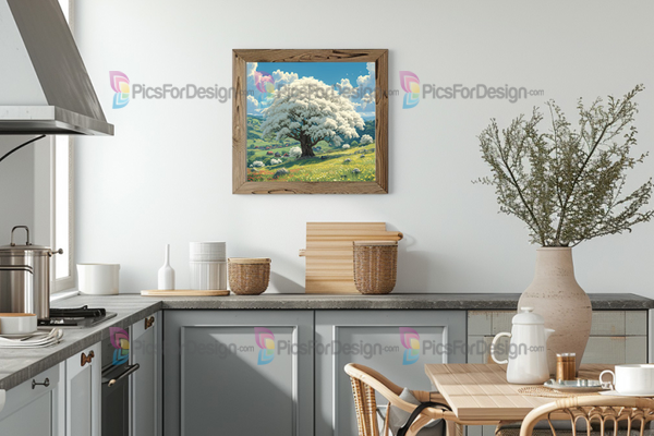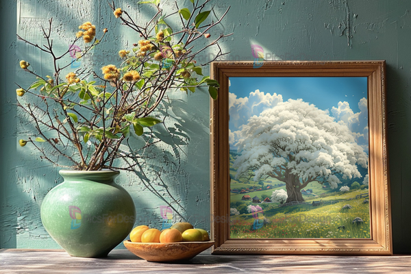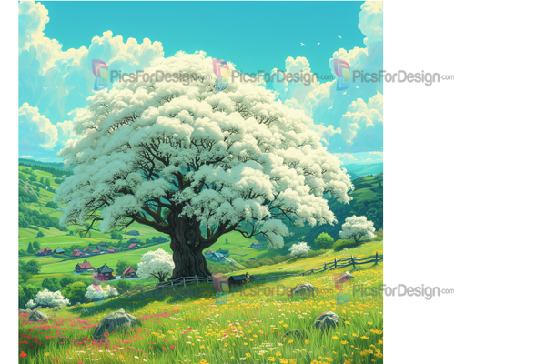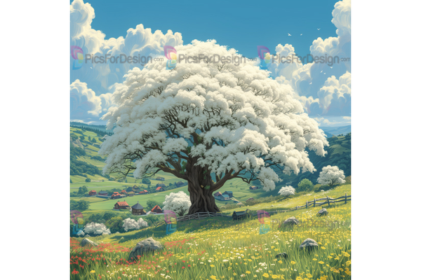 Painting, drawing, postcard, tree, milk, flowers, landscape, village, summer, green, white, yellow, fantasy, posters, graphic design, for interior, for printing, ai_generated