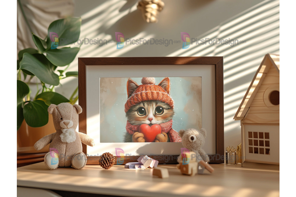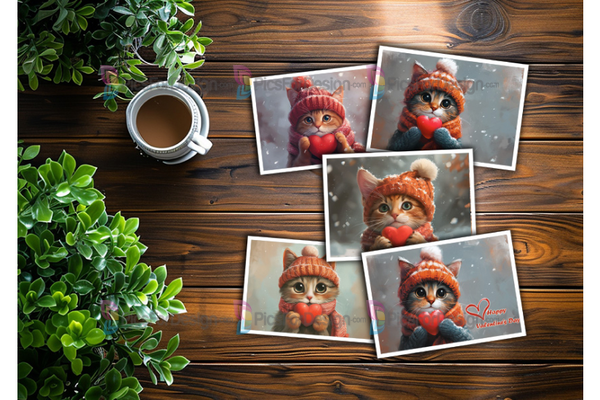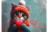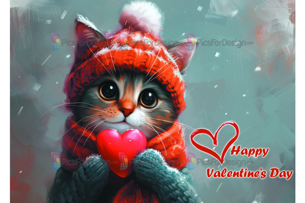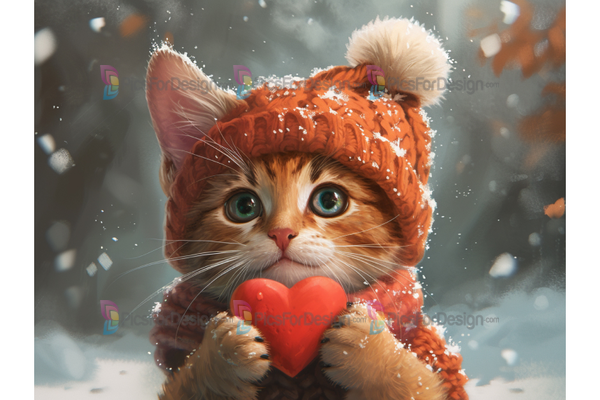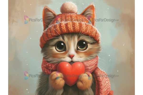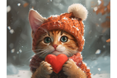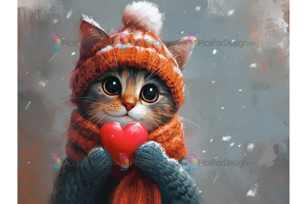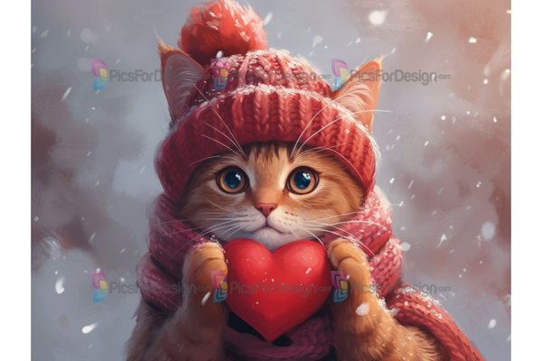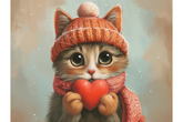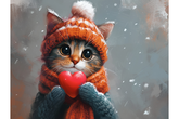 cat, heart, hat, scarf, winter, snow, love, kindness, gift, postcard, valentine's_day, fantasy, red, fluffy, eyes, painting, drawing, postcard, posters, graphic design, for interior, for printing, ai_generated