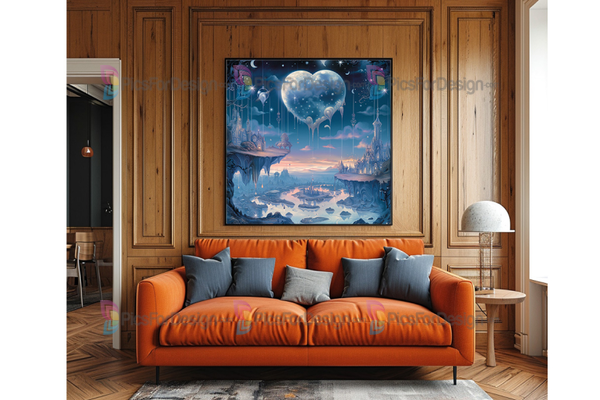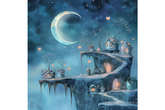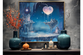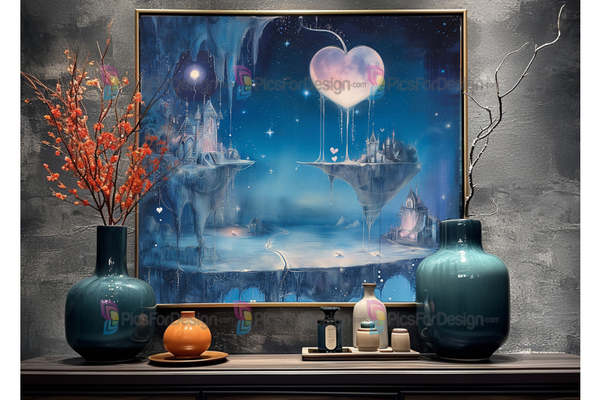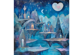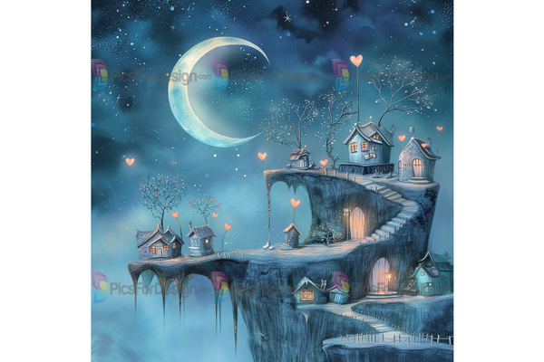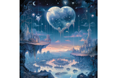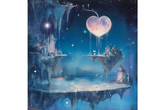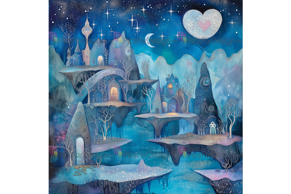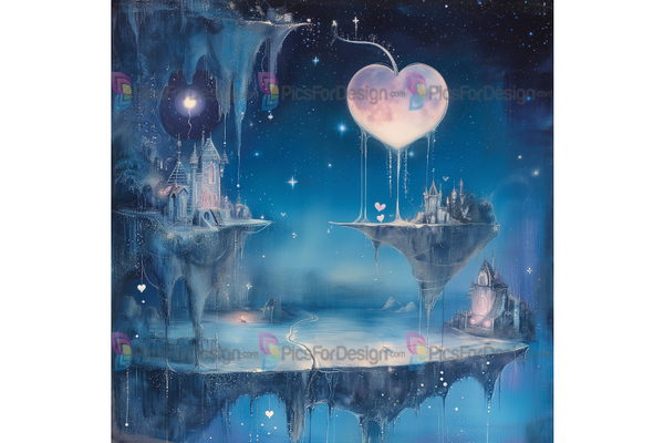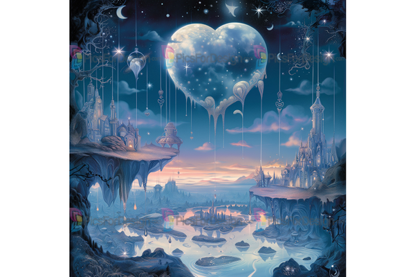 Valentine's_Day card, fantasy, surrealism, moon, heart, night, fabulous landscape, stars, miracle, charm, magical radiance, romantic atmosphere, blue, pink, purple, background, painting, drawing, postcard, posters, ai_generated